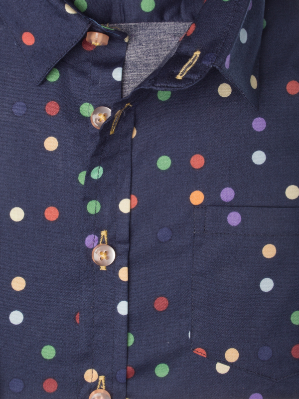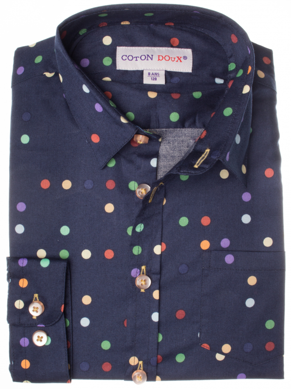 For a casual Sunday look, this navy blue shirt with colorful dots will be the perfect asset. With a pair of navy blue or pastel trousers, your kid will appreciate its comfort and casualness brought by the soft collar and loose cut. You, on the other hand, will appreciate stylish double-button cuffs.