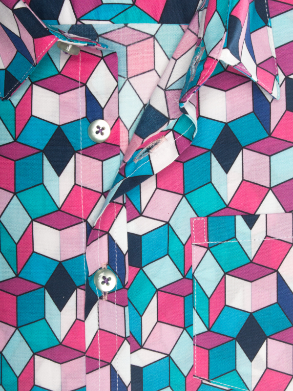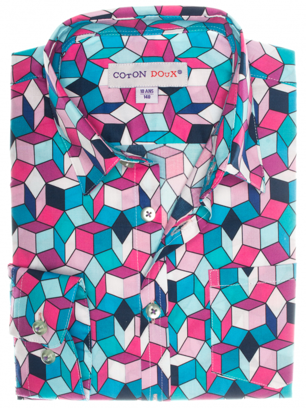If calculating volume is still something to master, your child will have nothing else to learn about cubes thanks to this geometric print! The combination of these dominant and vibrant blue and pink colours is quirky yet effictive. Worn with trousers or a skirt that are light blue or grey, it will be the perfect outfit and whoever wears it will definitely rock the shirt’s loose fit, soft collar and double-button cuffs.