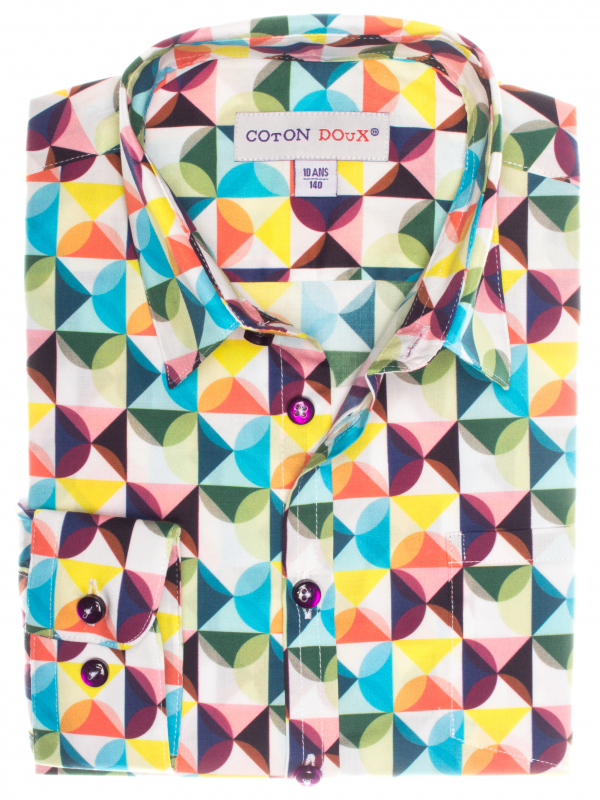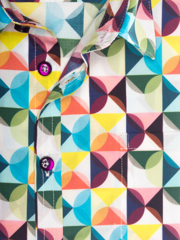 This geometric print shirt is the perfect balance between quirky and classical style. Its bright colours and diverse shapes will freshen up every outfit while its soft collar, loose fit and double-button cuffs add an elegant touch. Worn with a casual jacket and a pastel-coloured bow tie, this will be the perfect look for a casual sunday brunch!