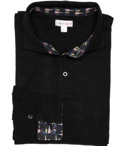 Are you a fan of aperitifs and good drinks? This black long sleeves polo shirt in pure cotton with a drinks motif will be your best ally. The drinks print hidden under the cotton piqué collar and the two-button placket will seduce many a partygoer. Its slim fit and double button cuffs will ensure you have a great night out. So go for it! Wear it without moderation with black jeans and a small red scarf for a total black casual look.
