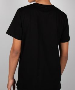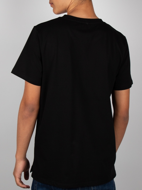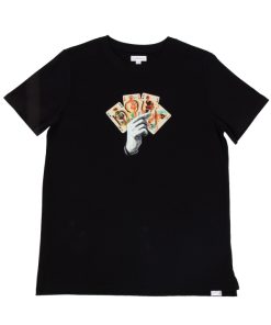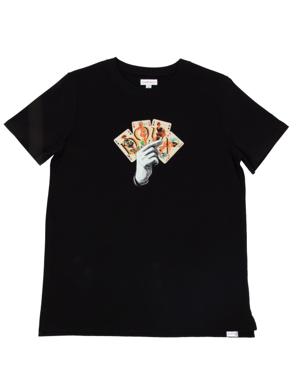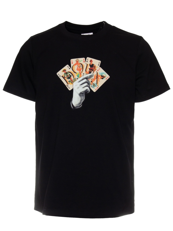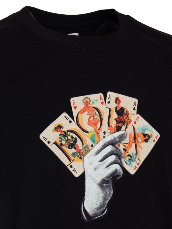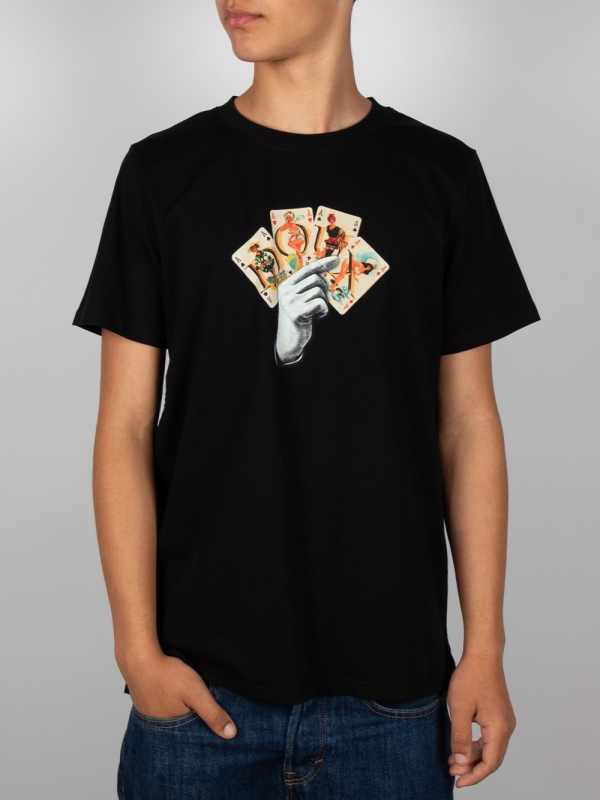 Deep black T-shirt featuring a central print of a hand holding vintage pin-up cards, blending boldness and retro style. Made from mercerized cotton for optimal softness and breathability. Unisex straight cut with a ribbed crew neck, back neck yoke, and double-needle stitching for a perfect fit. Side slits at the straight hem add a contemporary touch and extra freedom of movement.