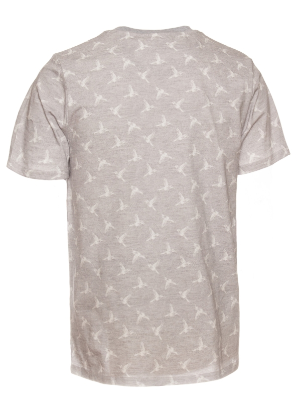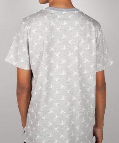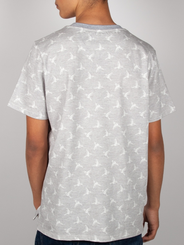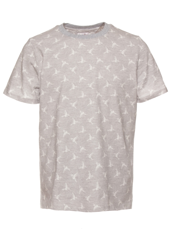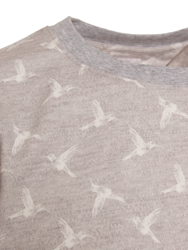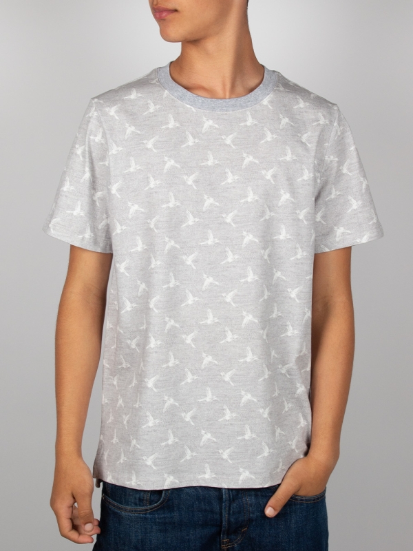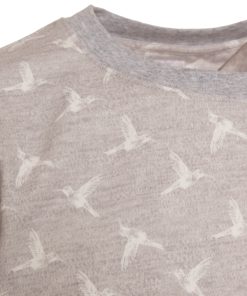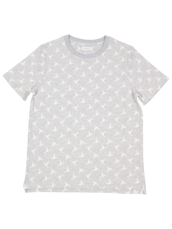 Heather grey T-shirt with white hummingbird print. Made from mercerized cotton for a soft, comfortable feel. Unisex straight cut with a ribbed crew neck, back neck yoke, and side slits for a modern touch. Finished with double-needle stitching for added durability. Perfect for a casual yet elegant summer look.