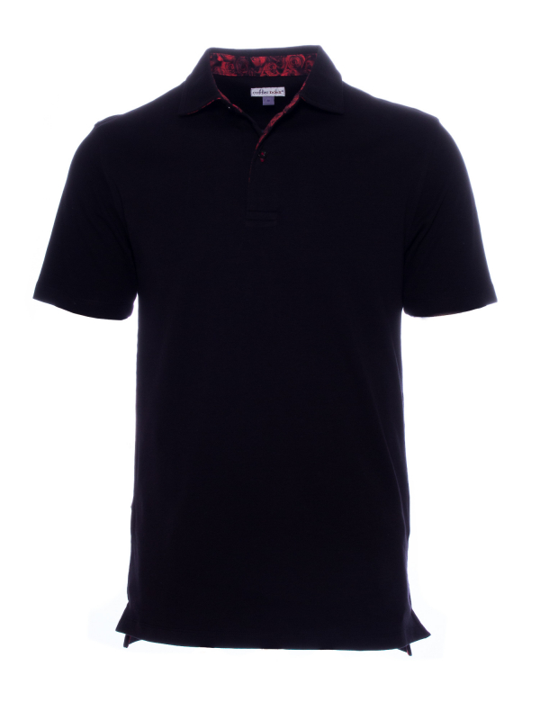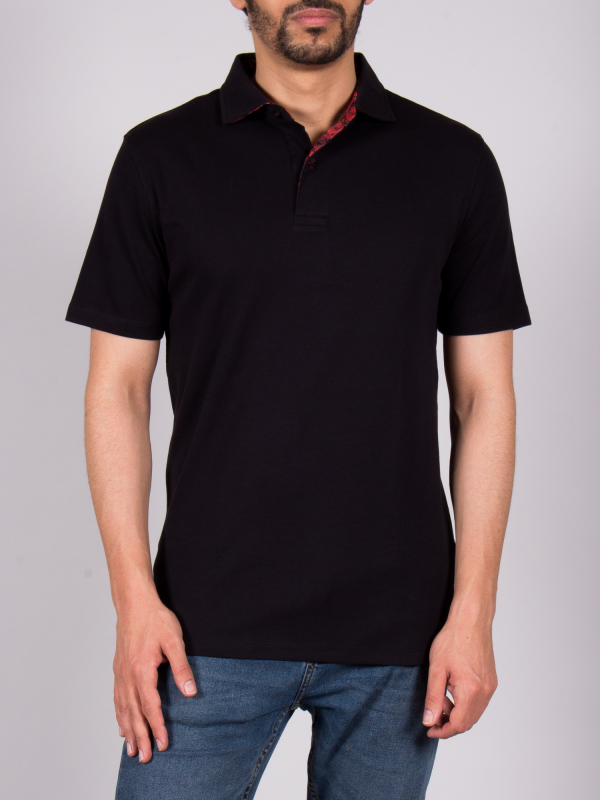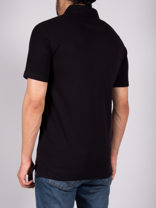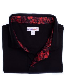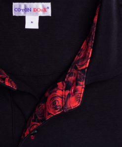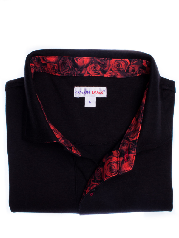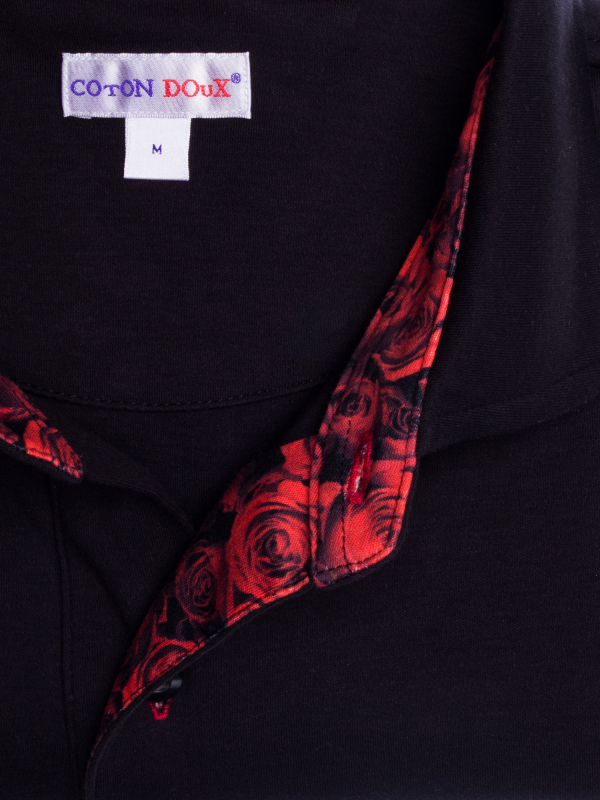 Be the most irresistible man wearing this black regular fit polo shirt with red roses inner print! Its mercerized cotton jersey and its open or closed two-button placket will give you a casual charmer appearance. Thanks to the details of the cotton quilted collar and the regular cut your appearance will still remain elegant. Show your mysterious side with black jeans and dark brown loafers, you won’t stay in the shade for long.