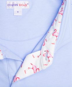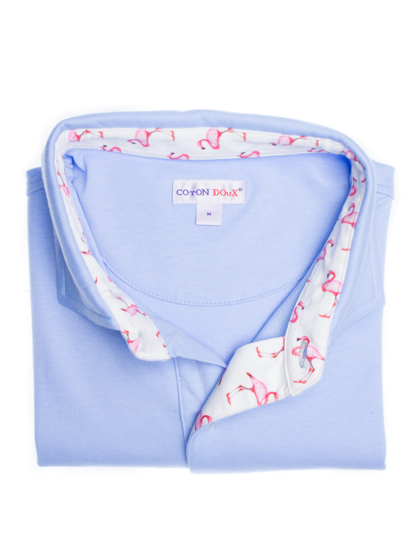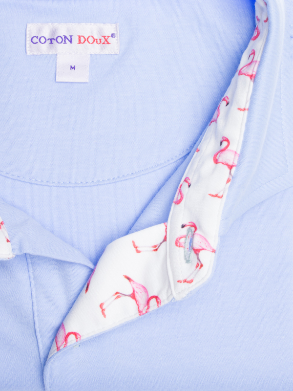 Blue and pink will be THE perfect combination of colors on this short sleeves plain light blue polo with flamingo inner lining print for an original look! The mercerized cotton jersey and the two-button placket will give you the comfort you are looking for without losing a piece of the elegance made by the cotton quilted collar and the regular cut. Bet on navy blue trousers to create a nice contrast and make the look perfect with black loafers!