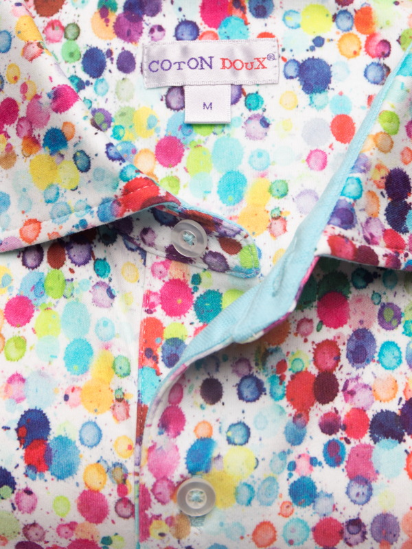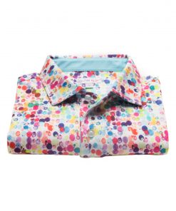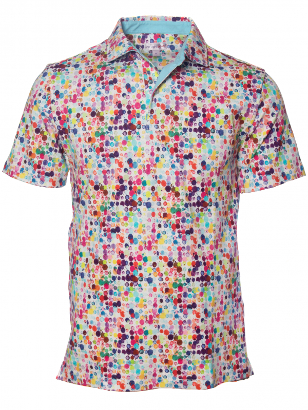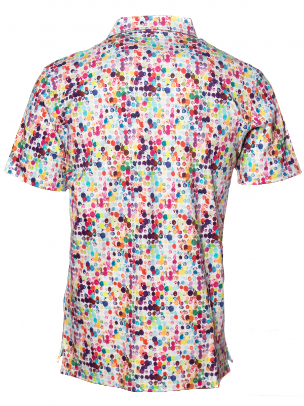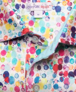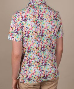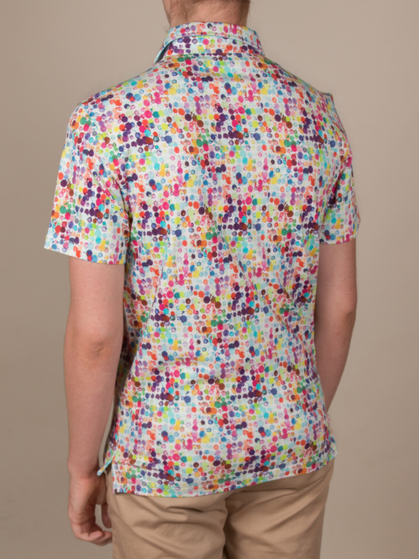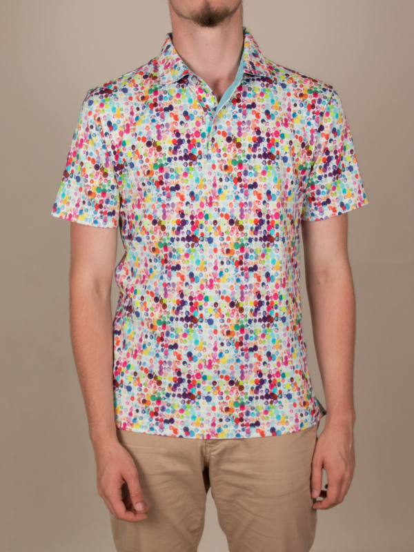 Want to bright up your wardrobe for the summer? Choose this fitted polo shirt with watercolor print! Its short sleeves and its composition in mercerized cotton jersey will make you feel comfortable right away. The summer colors will be perfect to cheer up any outfit, while the piqué cotton collar and two-button placket will bring the touch of elegance that you love so much.