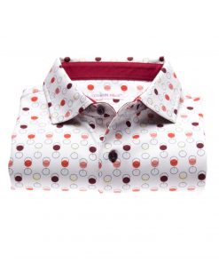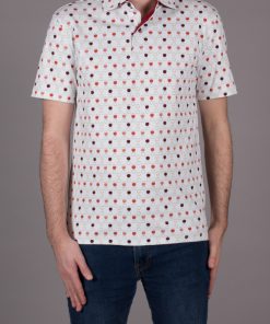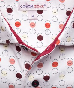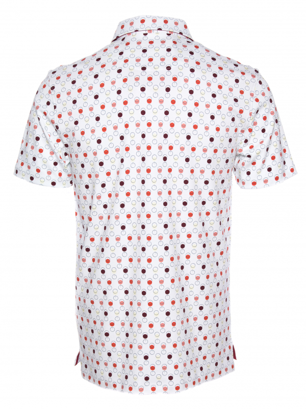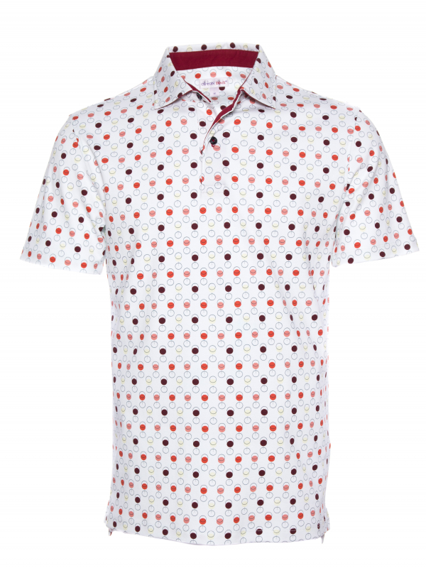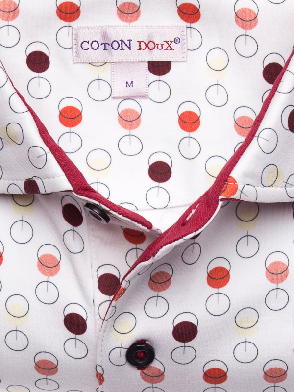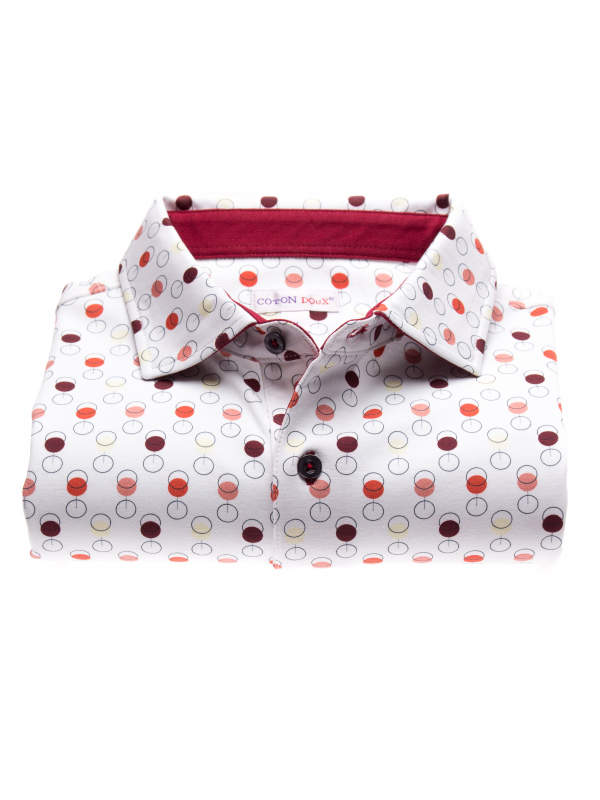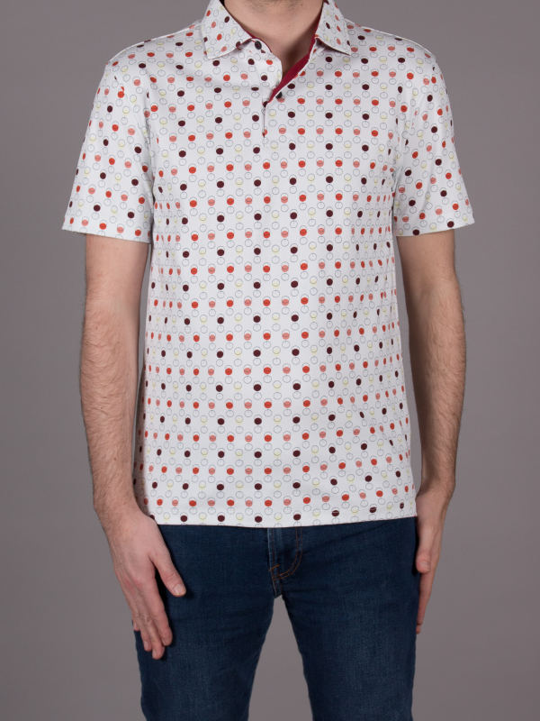 Epicurean at heart, enjoy this revamped wine glass print! With its geometric effect, it will be discretely worn over a burgundy chino, as a reference. Its cotton jersey composition and regular cut will also add to its charm, a pleasure to wear. Mark the contrast by highlighting its double button and its orange cotton piqué collar. This is a vintage outfit!