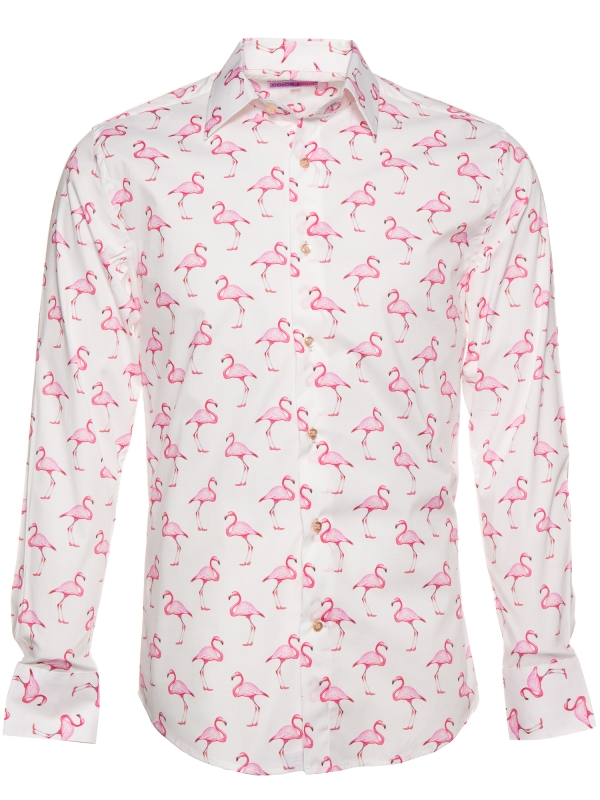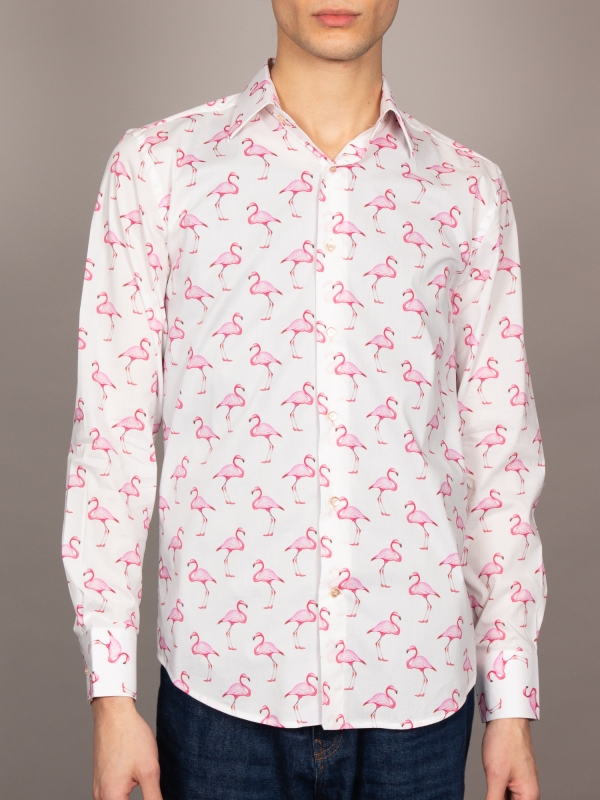 Bring a splash of tropical flair to your wardrobe with this shirt, featuring a bold flamingo print on a crisp white background. The vibrant flamingos, standing tall and graceful, offer a playful contrast to the clean, bright fabric. With its Milanese collar, single cuffs, and regular fit, this shirt delivers a sharp yet relaxed look. Pair with light trousers for a laid-back, eye-catching outfit that captures the essence of summer.