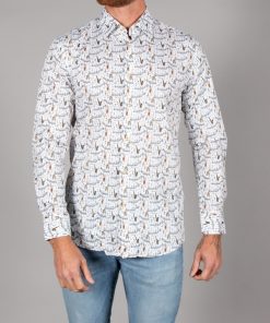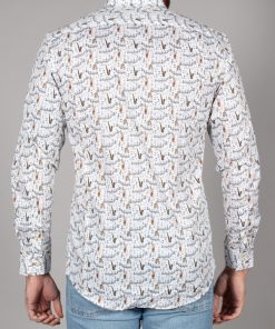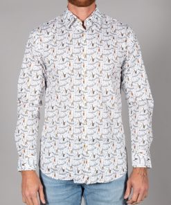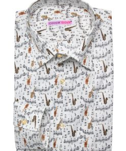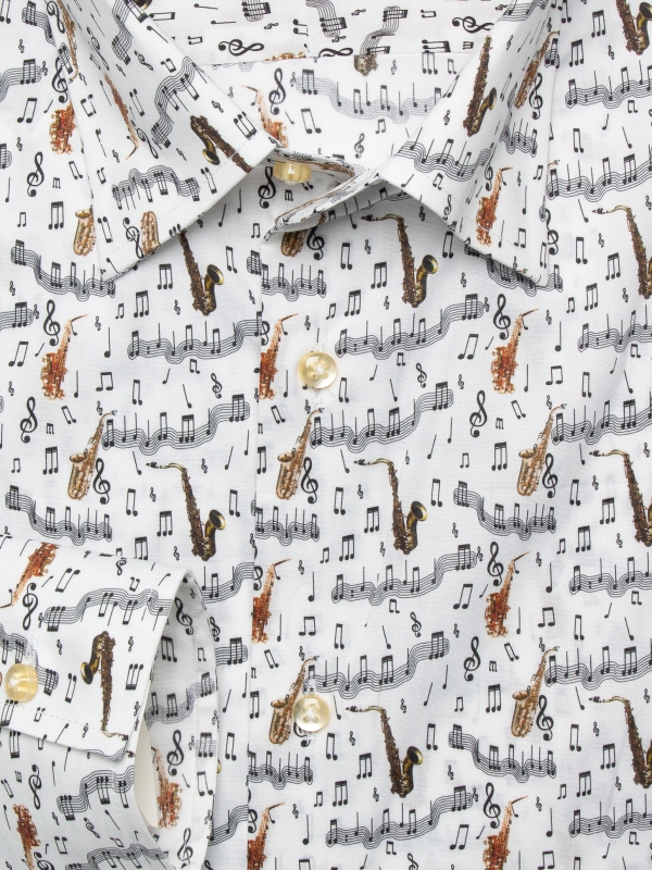 Wrap yourself in the melody of our Music Print shirt, where every note dances with poetic grace and harmony. The vibrant print sings a symphony of creativity.The Milanese collar lends a touch of refined rhythm, while the simple cuffs strikes a balance between style and comfort. Tailored in a regular fit, coordinate it with navy blue trousers and oxford shoes for a sophisticated and polished ensemble that complements the shirt’s artistic motif and elegant appeal.
