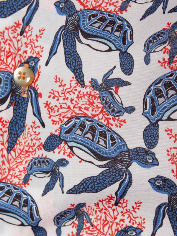 This shirt blends the serene elegance of the ocean with vibrant coral accents, featuring a playful turtle print that swims across a clean white backdrop. The harmonious mix of gentle turtles and bold coral evokes the natural beauty of the sea, capturing a moment of calm and vibrancy. The Milanese collar and single cuffs provide a touch of sophistication, while the regular fit offers relaxed comfort. Pair it with casual shorts for a look thatchannels the spirit of the ocean