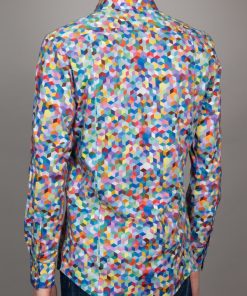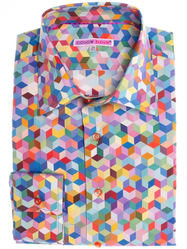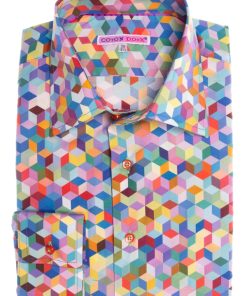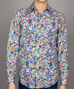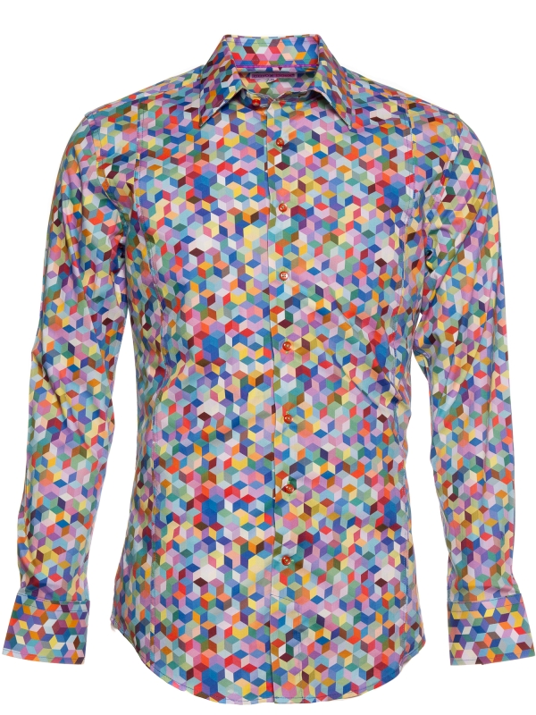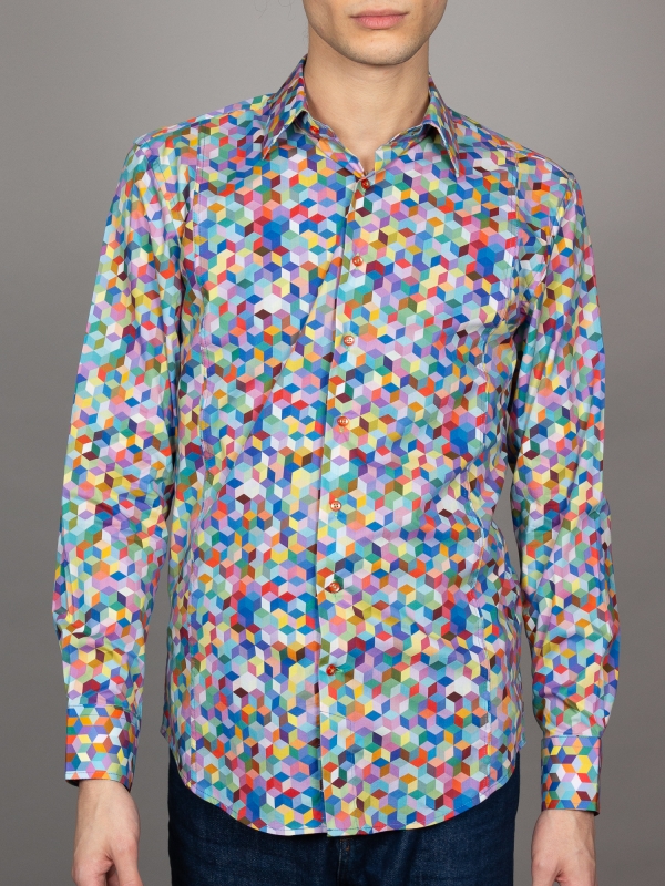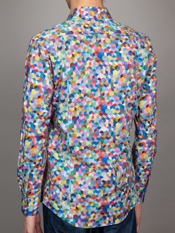 Step into a world of optical illusions with this shirt featuring a mesmerizing 3D cube print in vibrant multicolors. The slim fit, Milanese collar, and single cuffs add a sharp edge to the playful design. Perfectly pair it with tailored black trousers and minimalist sneakers for a striking look that blurs the lines between art and fashion.
