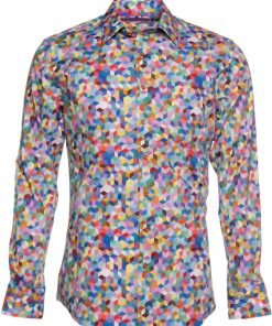 Step into a world of optical illusions with this shirt featuring a mesmerizing 3D cube print in vibrant multicolors. The slim fit, Milanese collar, and single cuffs add a sharp edge to the playful design. Perfectly pair it with tailored black trousers and minimalist sneakers for a striking look that blurs the lines between art and fashion.