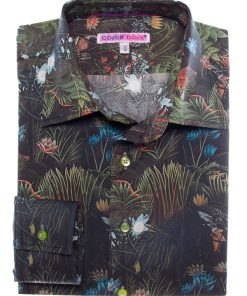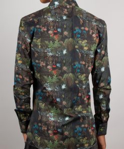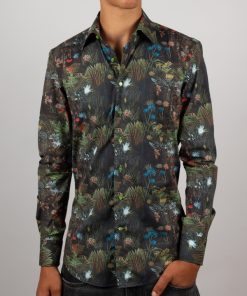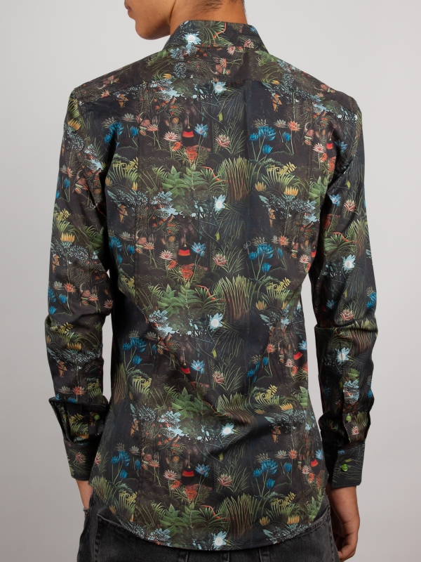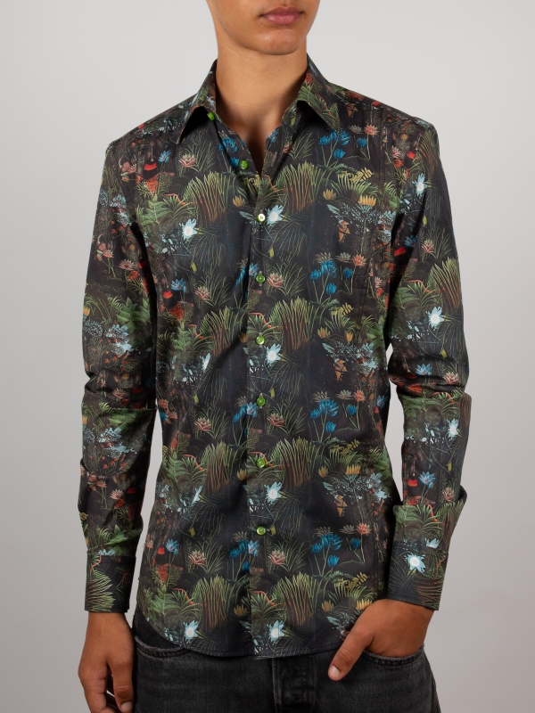 Immerse yourself in lush nature with this slim fitted shirt adorned with a vibrant jungle print. The abundant exotic foliage creates a bold, energetic silhouette. Featuring a Milanese collar and simple cuffs, the shirt blends elegance with a fitted cut that subtly enhances your contours. Perfect for a confidently nature-inspired, chic look.