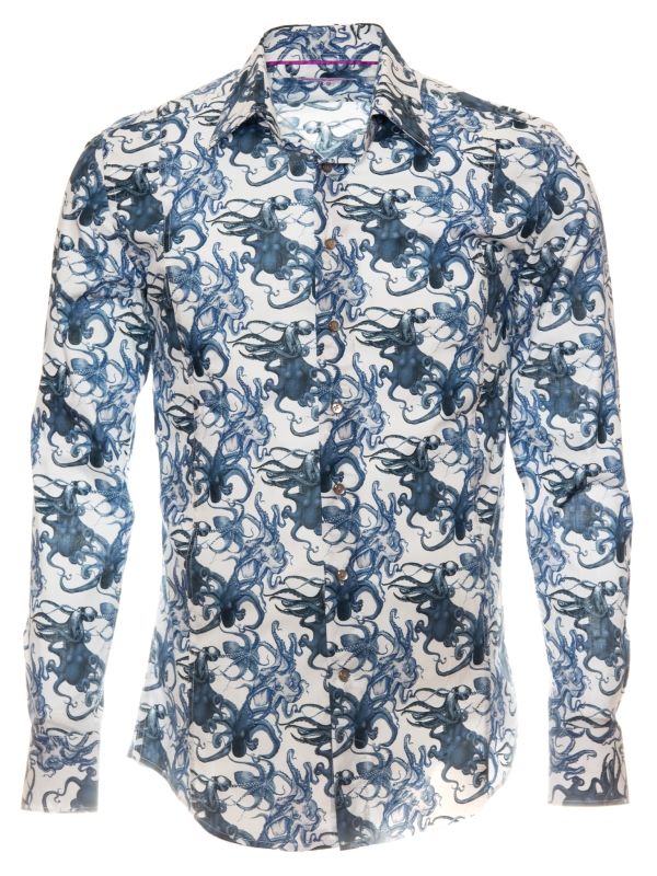 Blending originality and elegance, this slim fitted shirt features an octopus print with blue and white marine motifs inspired by the ocean’s depths. Set against a light background, the flowing designs bring freshness and mystery. The Milanese collar and simple cuffs offer a clean finish to this bold yet refined piece. Pair it with light-colored pants or jeans for a contemporary, unique look.