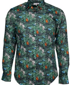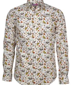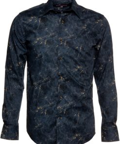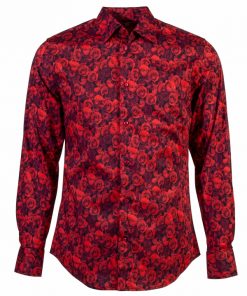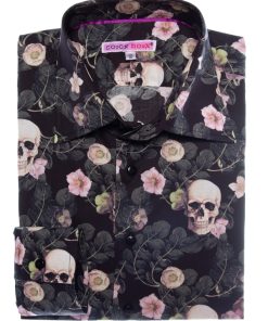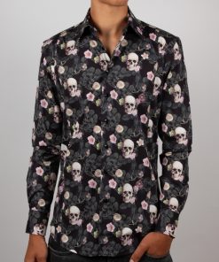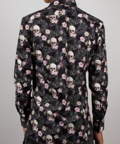 Bold and striking, this slim fitted shirt features a pink skull print that commands attention. Set against a deep black background, delicate floral and skull motifs create a subtle balance between softness and rock spirit. The Milanese collar and simple cuffs add refinement to this uniquely original piece. Pair it with raw denim or black trousers for a bold, contemporary look.