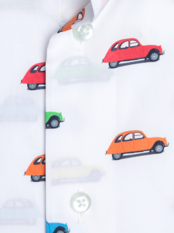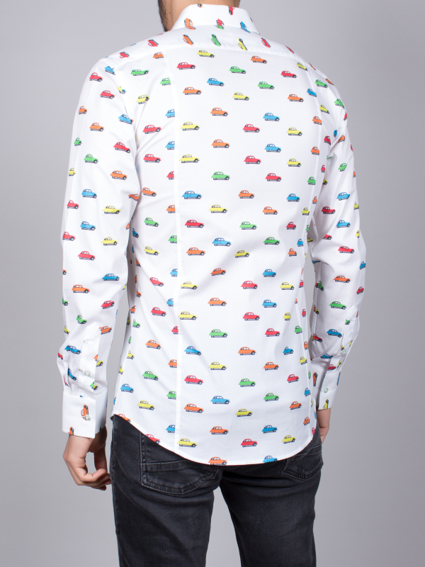 Professional collector or an amator, you will love this printed shirt. Its small cars print on the white background stand out in different colors and will be properly highlighted by colorful pants. You will appreciate also its Milanese collar, its slim fit and its very elegant single-button cuffs. Let’s run the engine!