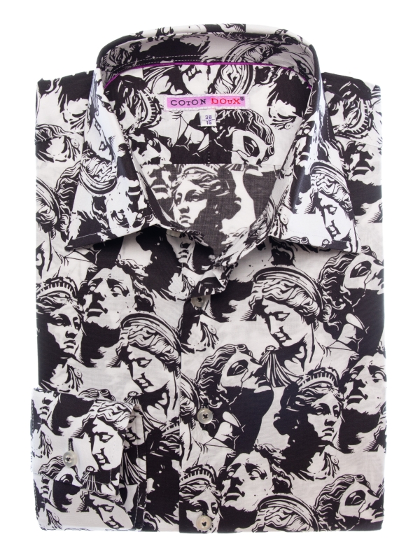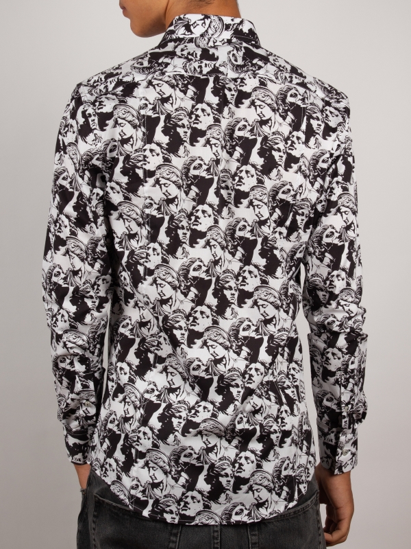 Elevate your style to an art form with this slim fit shirt featuring a statue print. The cut gently enhances the silhouette, while the Milanese collar and simple cuffs provide a polished finish. The pattern merges classical lines with a modern graphic spirit, creating a look that is both timeless and boldly contemporary. Perfect for a sophisticated and confident appearance.
