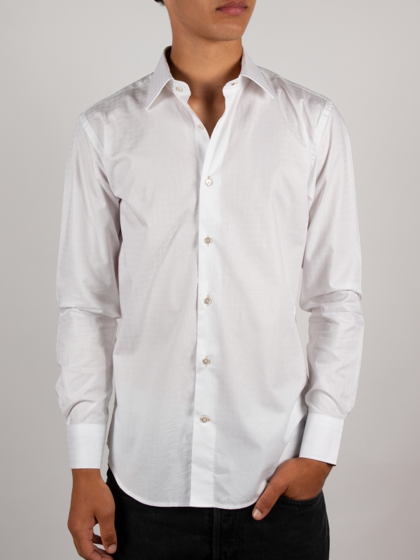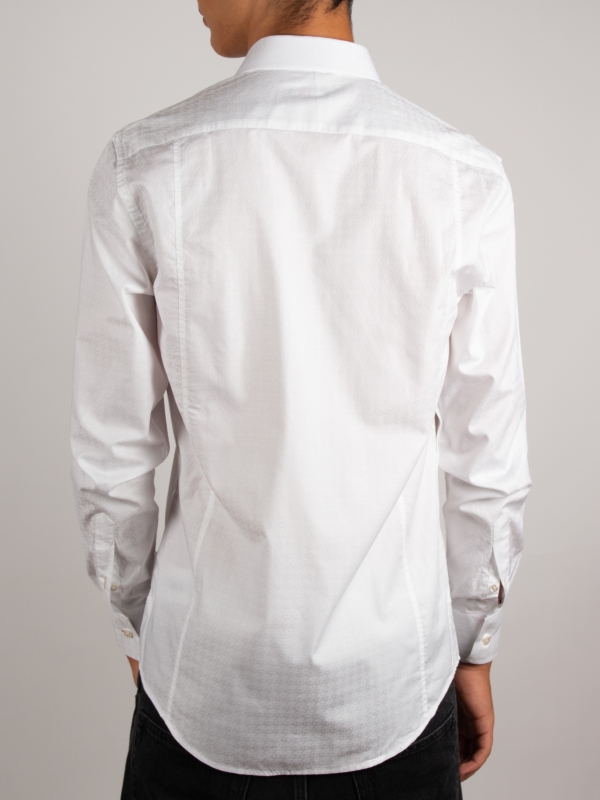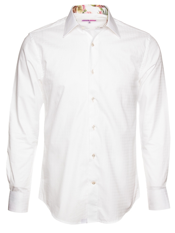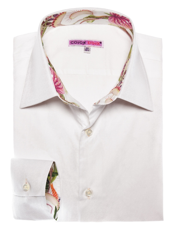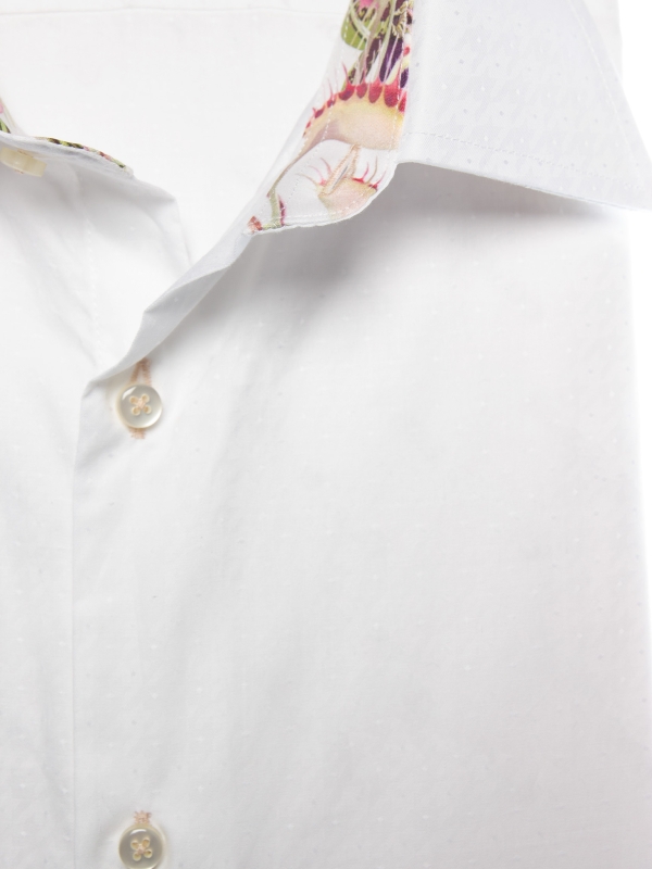 Discreet elegance at first glance, boldly creative in the details. The tone-on-tone jacquard weave adds texture and depth, while the tailored regular cut gives the silhouette a refined structure. Inside, a unique contrast featuring carnivorous plant motifs introduces a touch of controlled whimsy. Simple cuffs complete this sophisticated design, crafted for those who appreciate subtle contrasts and refined originality.