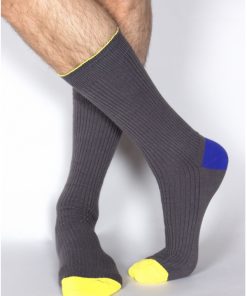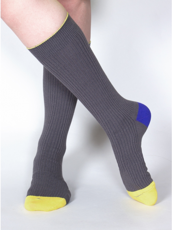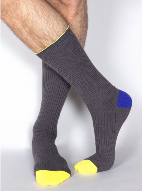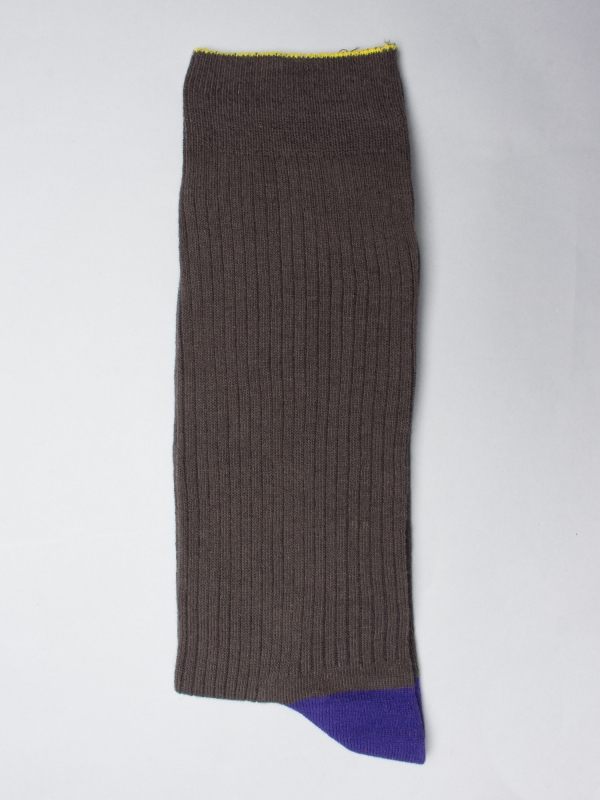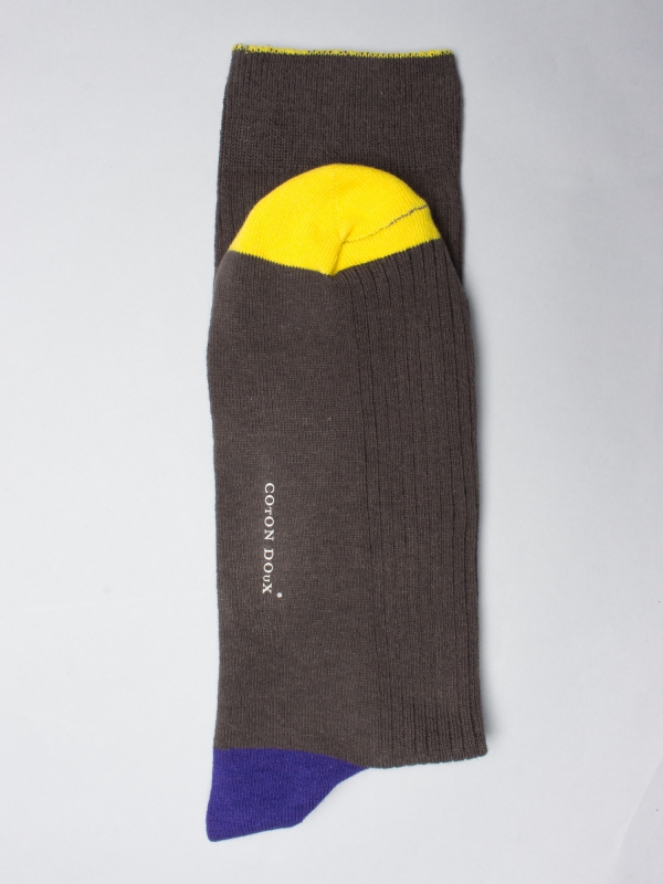 Coming in a timeless colour, this pair will soon become an irreplaceable piece in your wardrobe. Although the body gives a somber appearance, the extreme yellows and purples provide a leveol of subtle eccentricity. Whether you are wearing cropped trousers or not, these socks will flawlessly complement any burgundy, marine or green ensembles! 80% cotton / 18% polyamide / 2% elastane
