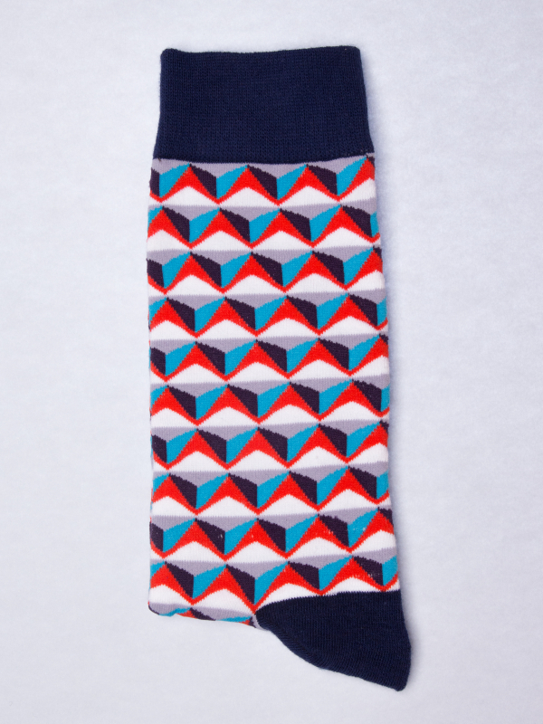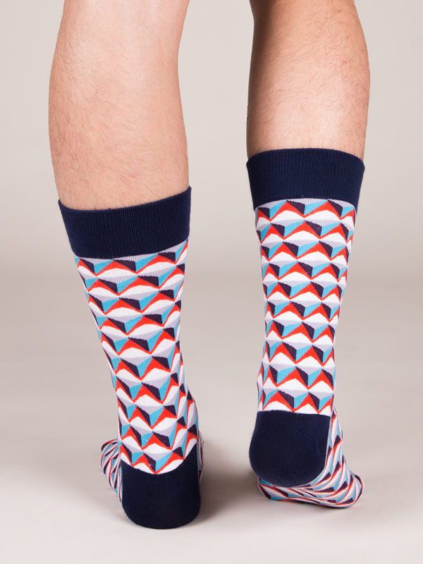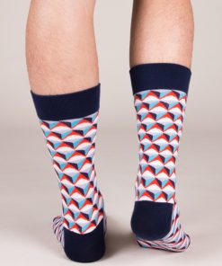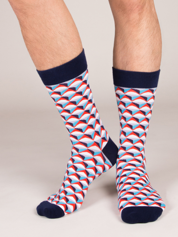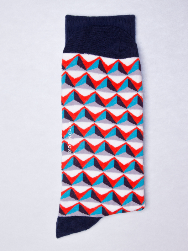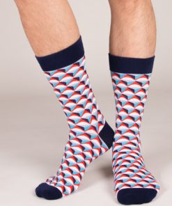 Want to be sophisticated and discreet? You will find happiness by choosing these socks with optical geometric patterns. Its forms and its trio of blue, red and grey colours will easily match your monochrome suits.