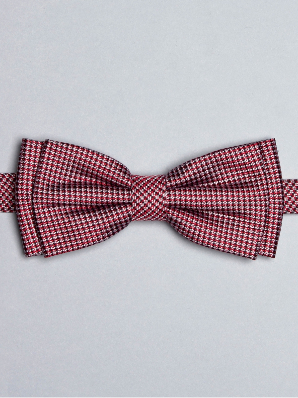 Be daring with this colourful silk bow tie. It’s pink black and white touches go well with a black shirt and a dark suit for a smart look.