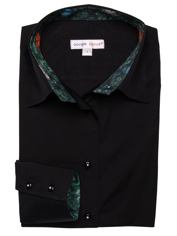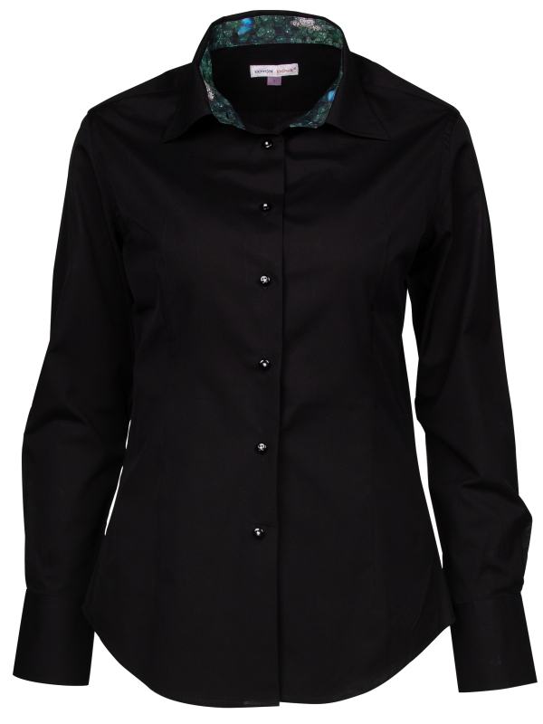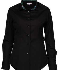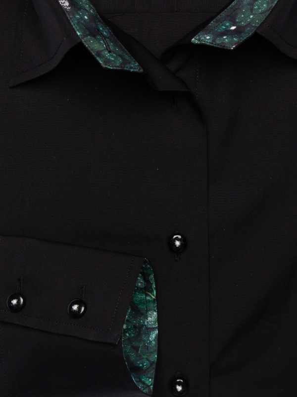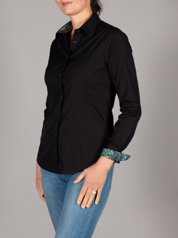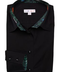 Transform your style with our women’s black poplin fitted shirt, featuring a charming clover inner lining print. The sleek black poplin exterior is perfectly contrasted by the playful clover pattern inside, adding a touch of uniqueness to a classic piece. Designed with a classic collar and double-button cuffs, this slim-fit shirt offers both sophistication and comfort.Pair it with tailored trousers and heels for a polished look.