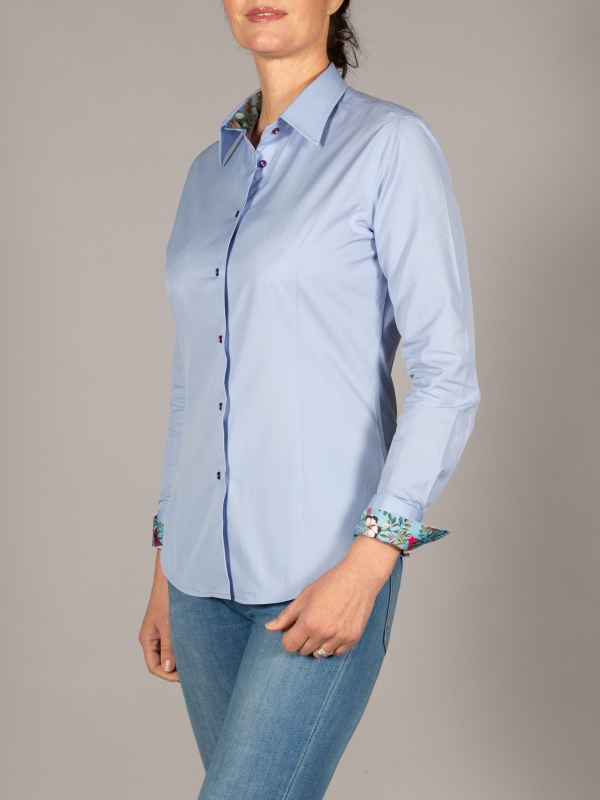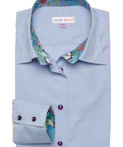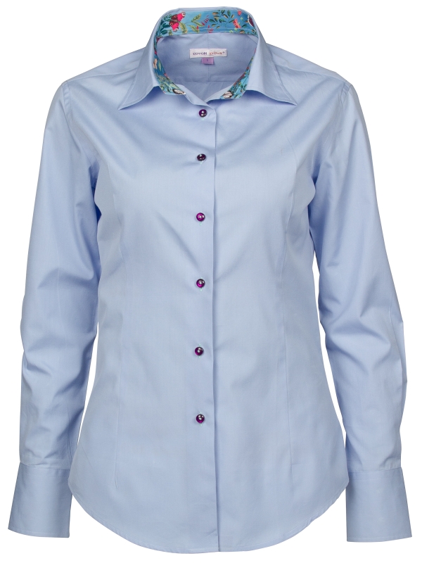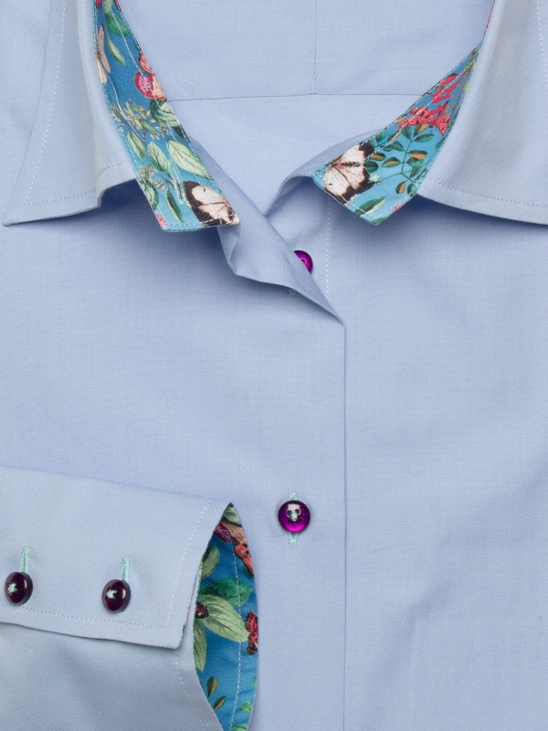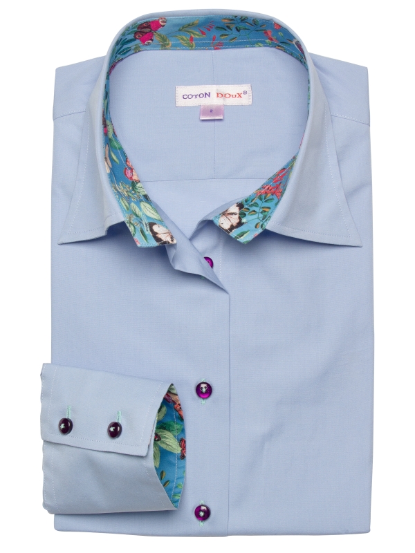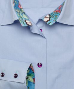 Coton Doux Women’s Blue Poplin Fitted Shirt With Butterfly Inner Lining Print