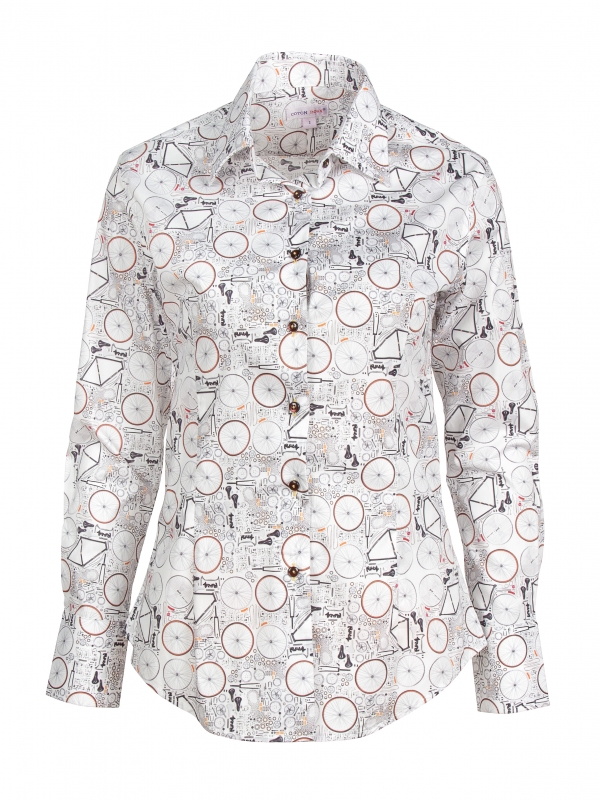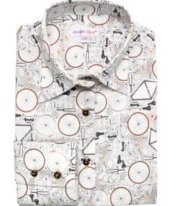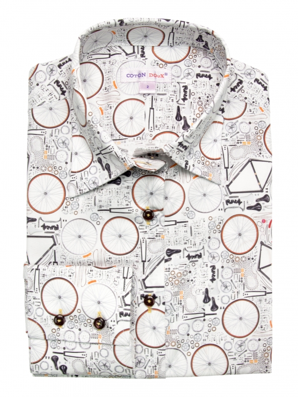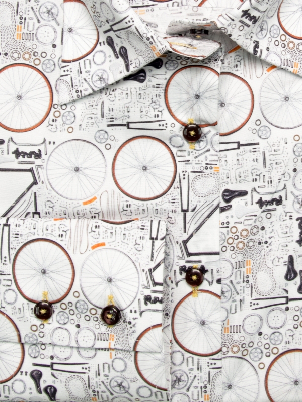 Stuck in a style rut? Ditch the fashion struggle and slip into our slim fit shirt featuring a playful, abstract bicycle print. The classic collar and double-button cuffs keep things polished, but it easily transitions to casual withcolourful Bermuda shorts. Need a professional vibe? Pair it with a sleek grey pantsuit for a winning look.