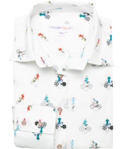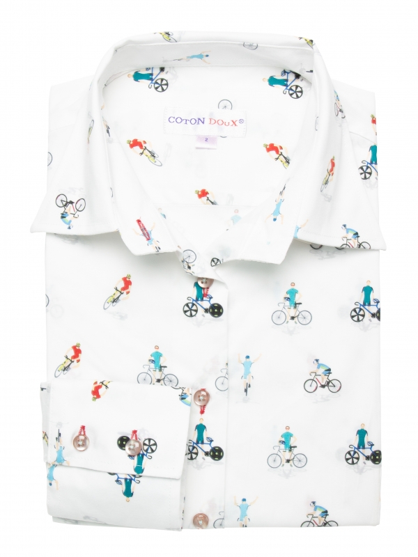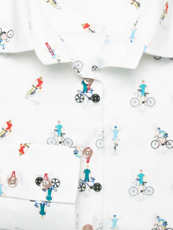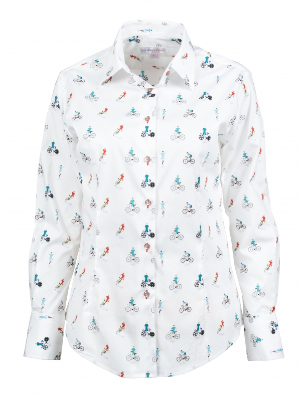 Ride into fashion with this bicycle-print shirt that takes you on the stylish path of two-wheel elegance! Featuring a classic collar and double-button cuffs, this shirt offers a tailored fit propelling you into a fast-paced style. Pair it with a brown leather skirt for an elegant contrast and tall black leather boots for a bold and feminine look. Complete your outfit with a long and elegant wool coat for a sophisticated touch. This shirt will take you beyond the beaten paths of fashion, embarking on an adventure with elegance, whether on a bike or on foot!