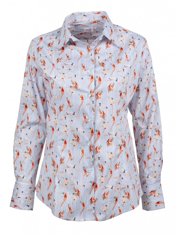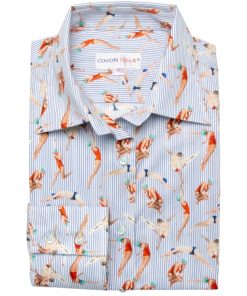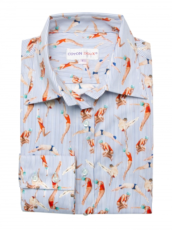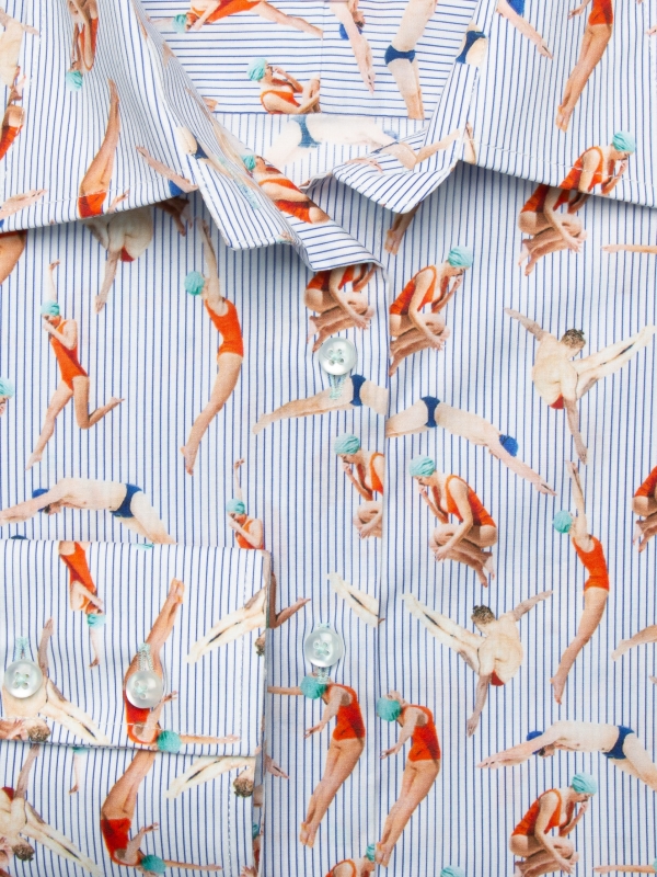 Immerse yourself in refreshing style with this diver-print shirt! The classic collar, double-button cuffs, and tailored fit enhance your figure, complemented by gray stripes resembling underwater silhouettes. Pair with black leather slim pants for sophistication or gray chinos and slightly tall boots for flair. Break the casual look with an oversized denim jacket and dive into originality!