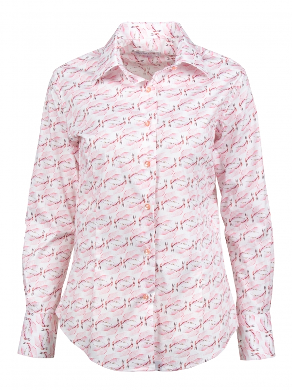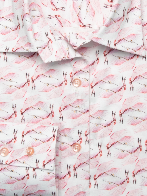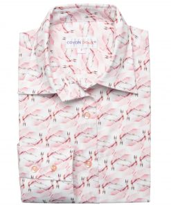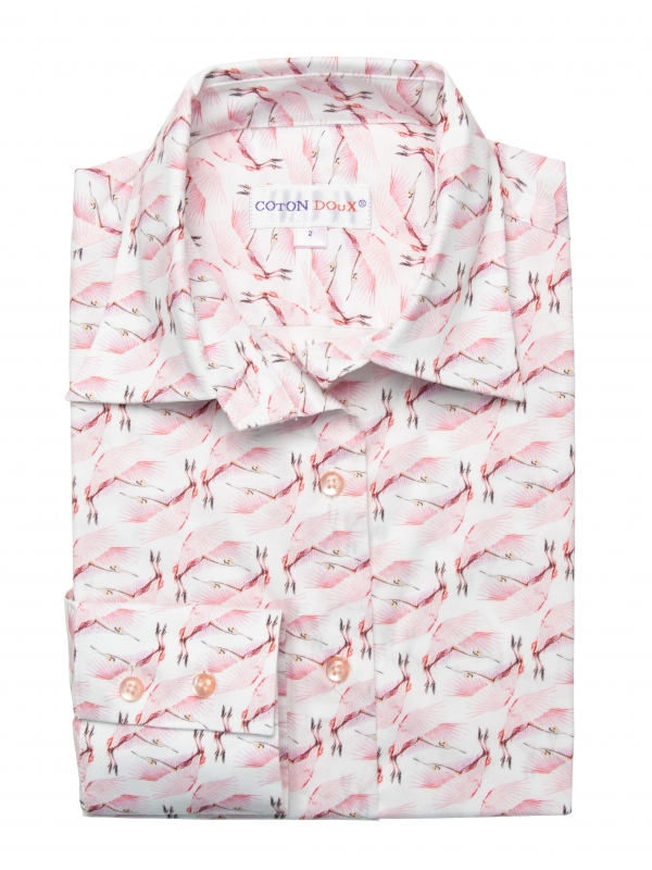 Brighten your day with a true ray of sunshine in this flamingo-print shirt that will transport you to the enchanting atmosphere of the Camargue! With its classic collar and double-button cuffs, this shirt offers a tailored fit exuding elegance. For a refined look, pair it with burgundy velvet cigarette pants and matching leather loafers, then add a trench coat for a touch of sophistication while staying warm. Let yourself be carried away by the enchanting atmosphere of flamingos and the Camargue, where elegance meets the magic of nature!