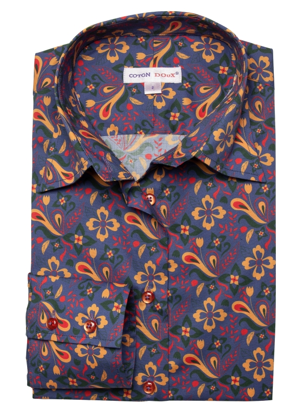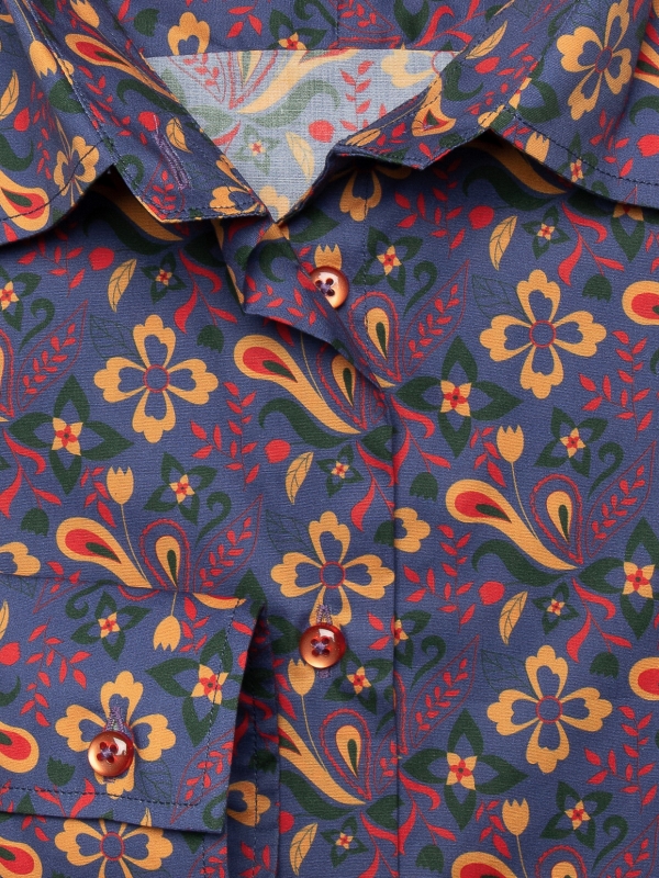 Step into a realm of refined elegance with our Floral Fresco Print shirt, inspired by intricate floral designs reminiscent of Renaissance art. This shirt combines timeless sophistication with a modern twist, featuring a classic collar and double-button cuffs that add a touch of refinement. The slim fit offers a sleek, tailored look, effortlessly blending style and comfort. Pair it with tailored beige trousers and brown leather loafers for a polished ensemble.