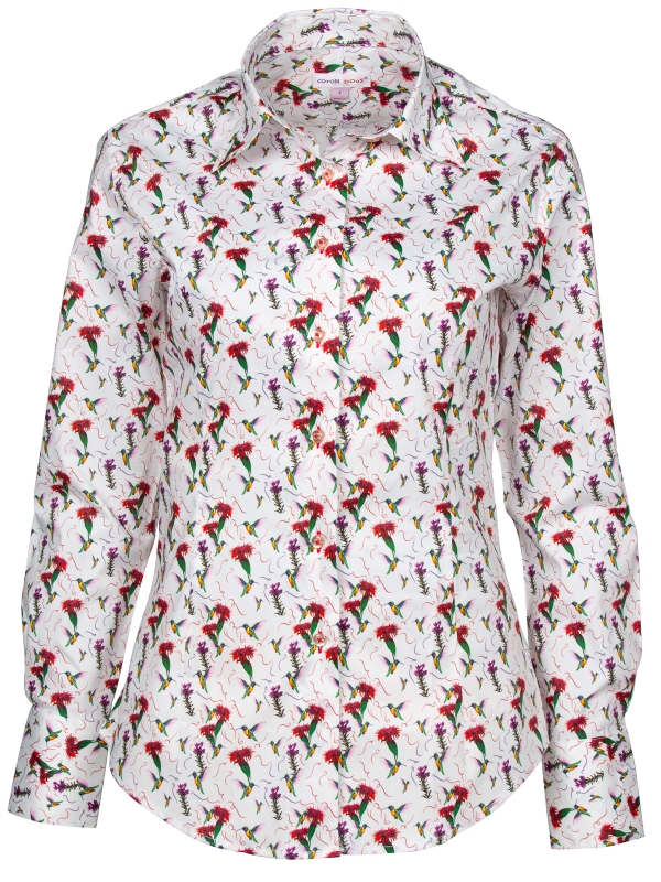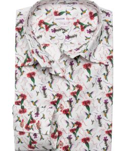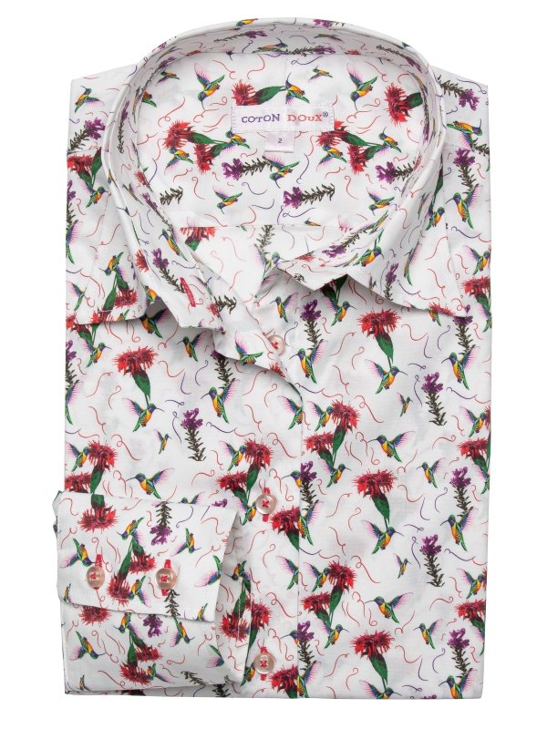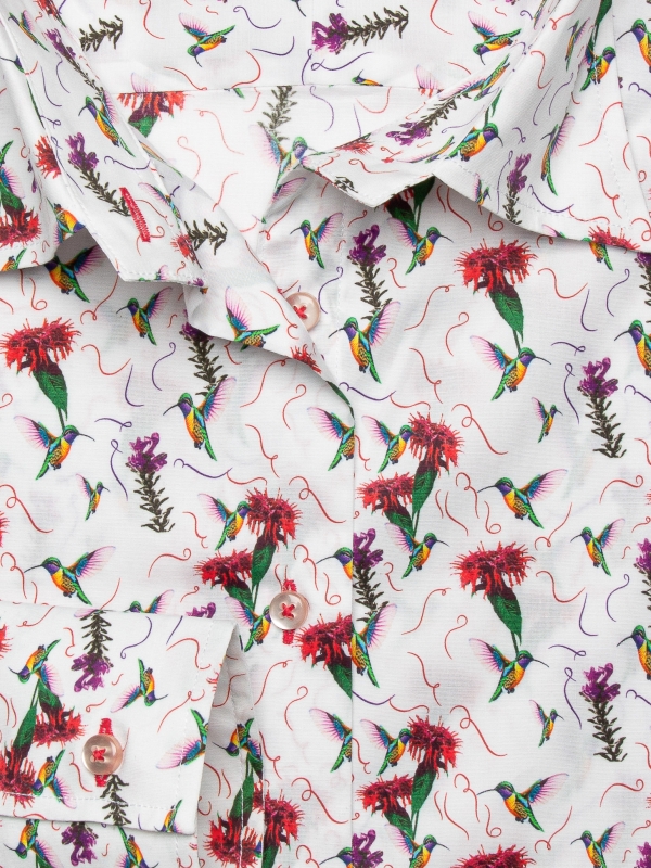 Soar into style with our Hummingbird Print shirt. Adorned with graceful hummingbird motifs, featuring a classic collar and double-button cuffs, it adds a refined touch to your ensemble. The slim fit provides a modern, tailored silhouette, perfect for any occasion. Pair it with dark blue denim jeans and tan suede loafers for a chic yet relaxed look. This shirt promises to make you stand out with whimsical sophistication wherever you go.