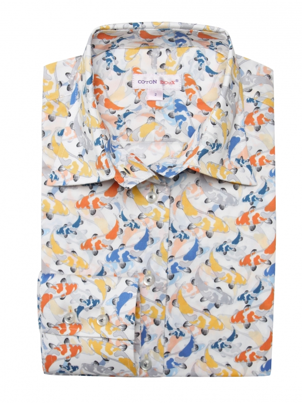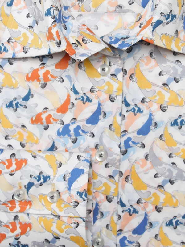 Immerse yourself in this koi fish print shirt and let yourself be transported on the waves of boldness. Although atypical by its design and its association of colors between blue, orange and yellow, you will appreciate to wear it in any occasion. Its classic collar and double-button cuffs guarantee a good fit and its slim fit a nice silhouette. Go for a denim look between a jacket and high waisted jeans.