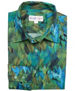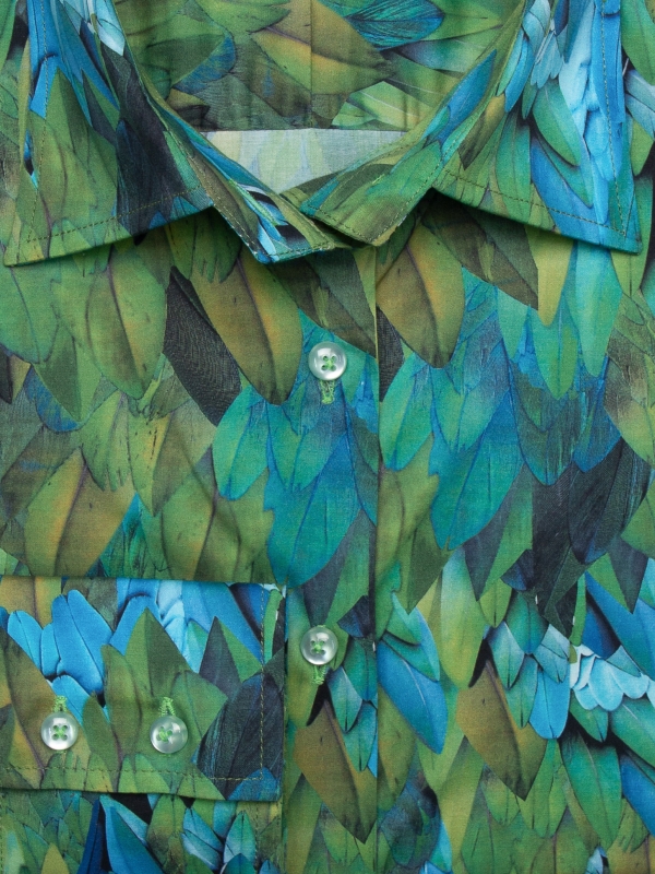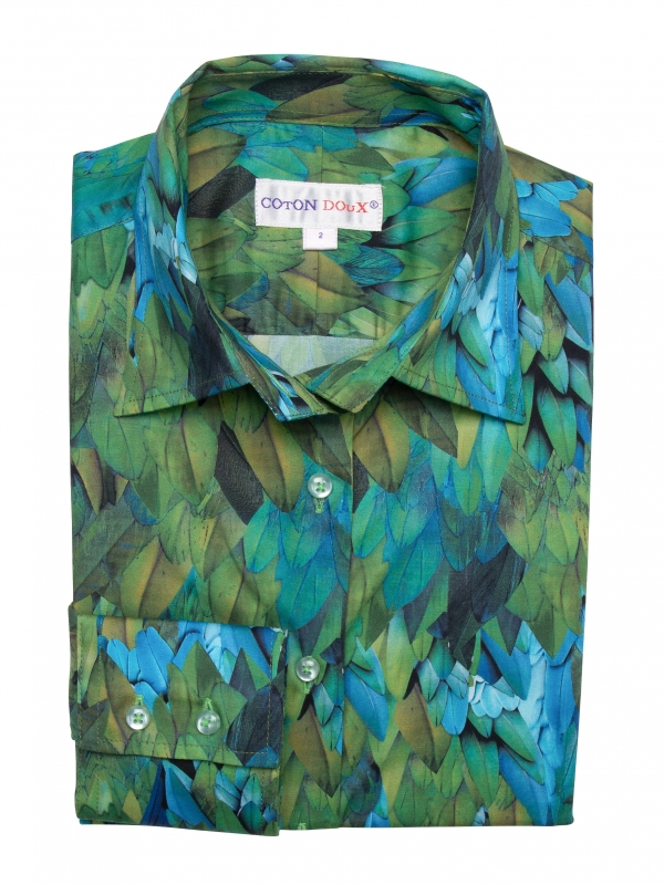 Explore the unmatched elegance of this peacock feather-print shirt that invites you into a world where fashion takes flight with grace! Featuring a classic collar and double-button cuffs, this shirt comes with a tailored fit for a distinguished look. Create a chic and colorful ensemble by pairing this shirt with a fitted black corduroy pants and emerald green suede ankle boots to echo the color of the feathers. Add a touch of sophistication by wearing a long black wool coat, reminiscent of the splendor of nature. Celebrate the beauty and grace of nature and let yourself be carried away by its exotic elegance.