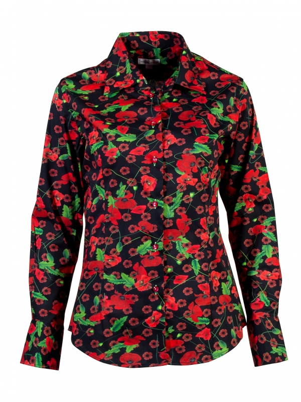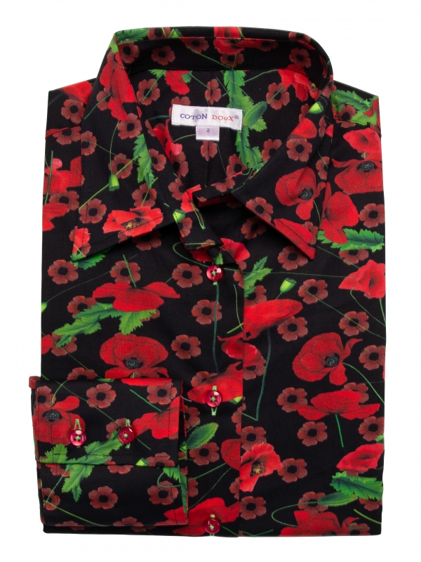 Usually found in fields, this shirt with poppy print boldly stands out against this intense black background. Great contrast! You’ll love wearing this shirt under a black pants suit for a striking effect with a classic collar and double-button cuffs that stand out discreetly from the jacket and varnished shoes, this is a red and black style of rare elegance.