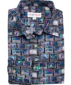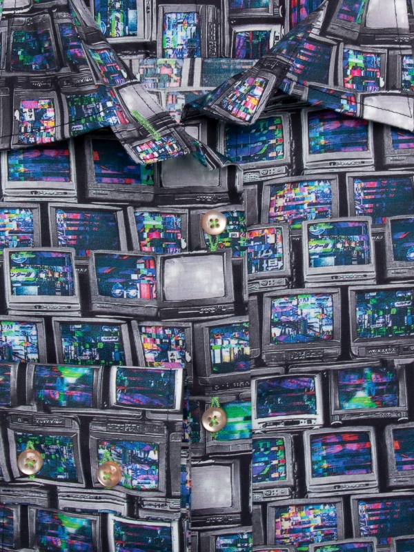 Relive waves of nostalgia with this television-print shirt ! Featuring a classic collar, double-button cuffs, and a tailored fit, it blends modernity with a vintage spirit. For the outfit, pair it with a black leather skirt for a bold and trendy look, leather ankle boots for a retro touch, and top it off with a denim bomber jacket for that extra flair. Ready for a journey through time?