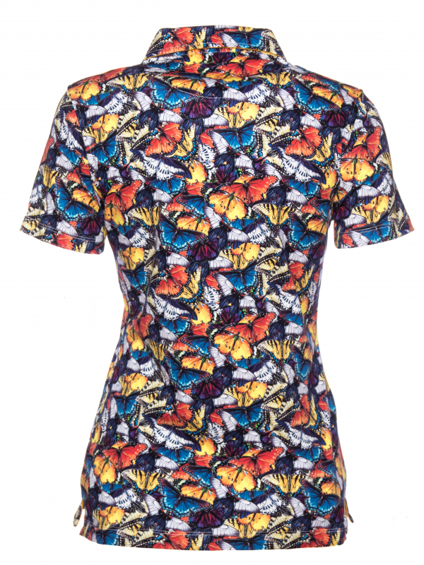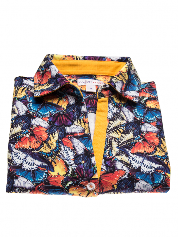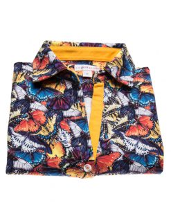 This butterfly print polo will ensure you a style full of colors, for winter as well as summer, thanks to the different shades and the mercerized cotton jersey. Its orange piqué cotton collar and three-button placket will nicely contrast with navy blue chino pants or jeans. And you will love wearing its slim cut.