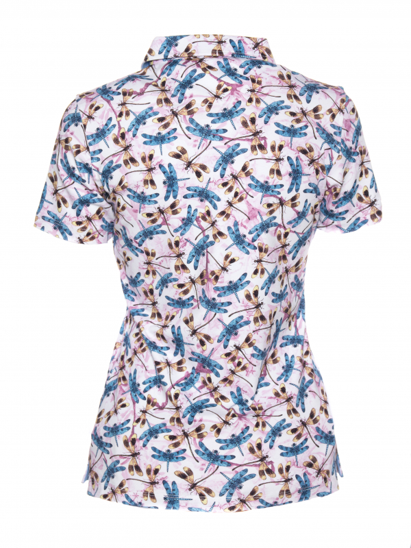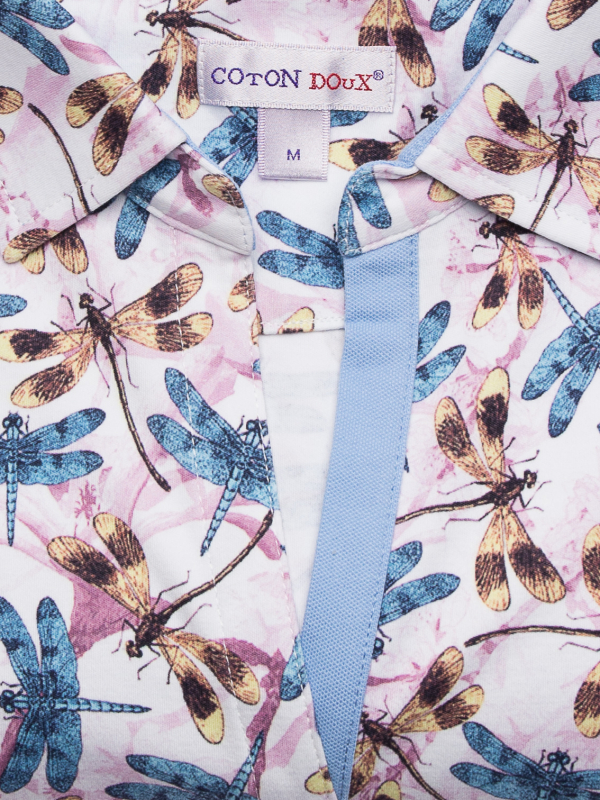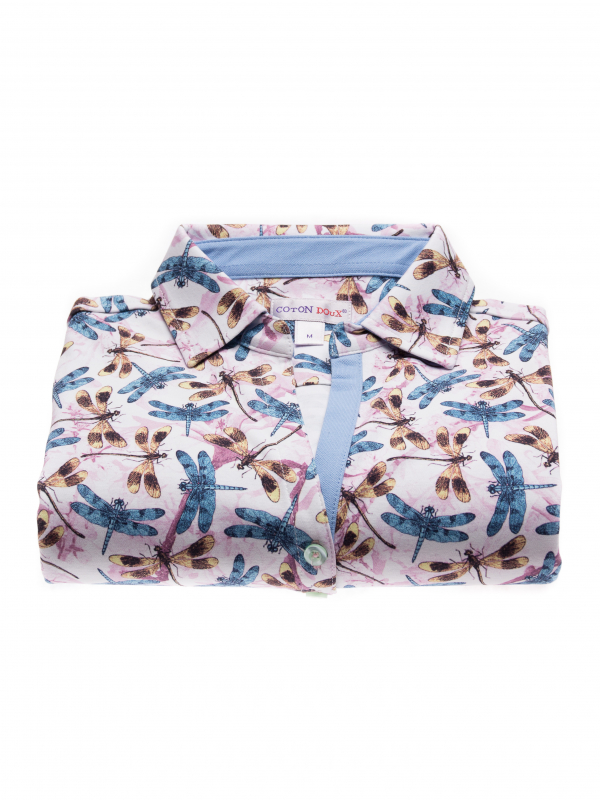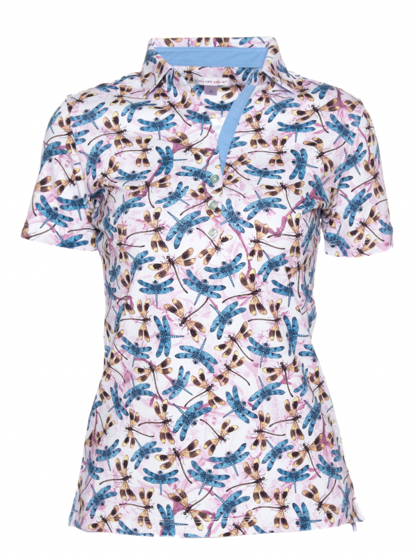 Be ready to take off with these dragonflies and enjoy the summer sky! This yellow and blue dragonfly print polo shirt is easy to wear with jeans or a light blue chino.Made with jersey of cotton, piqué collar and three-button placket this polo will provide you comfort and elegance.