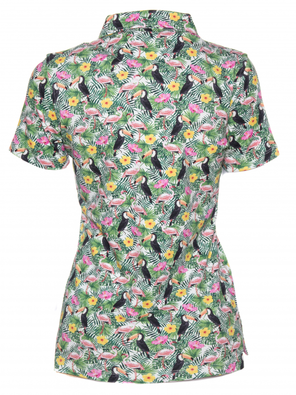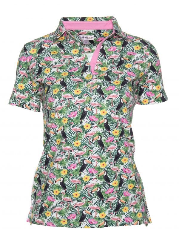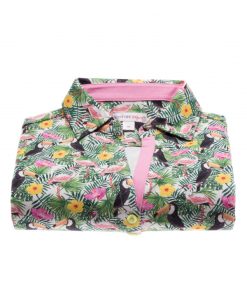 Nothing better than a tropical bird print to decorate this polo shirt in jersey of cotton? Toucans and flamingos cohabit happily and will be perfectly highlighted on white linen shorts. A decontracted look but also elegant grace of its piqué collar, three-button plackets, its lines and its regular fit. Its composition will provide you softness.