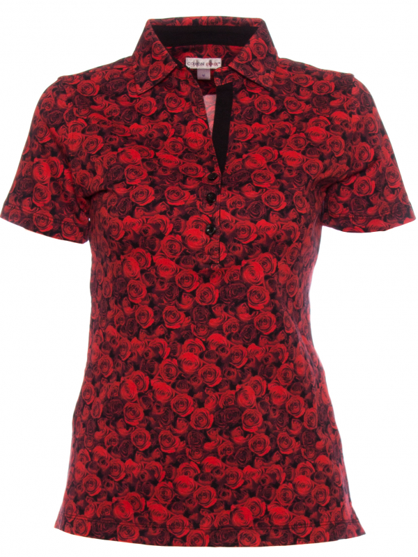 Make this red roses print your best asset with this kissing short sleeved polo shirt. Its mercerized cotton jersey and three-button placket will make it charming and casual while its plain piqué cotton collar will give it elegance. Black skirt and pumps will sublimate everything for a most fatal style!